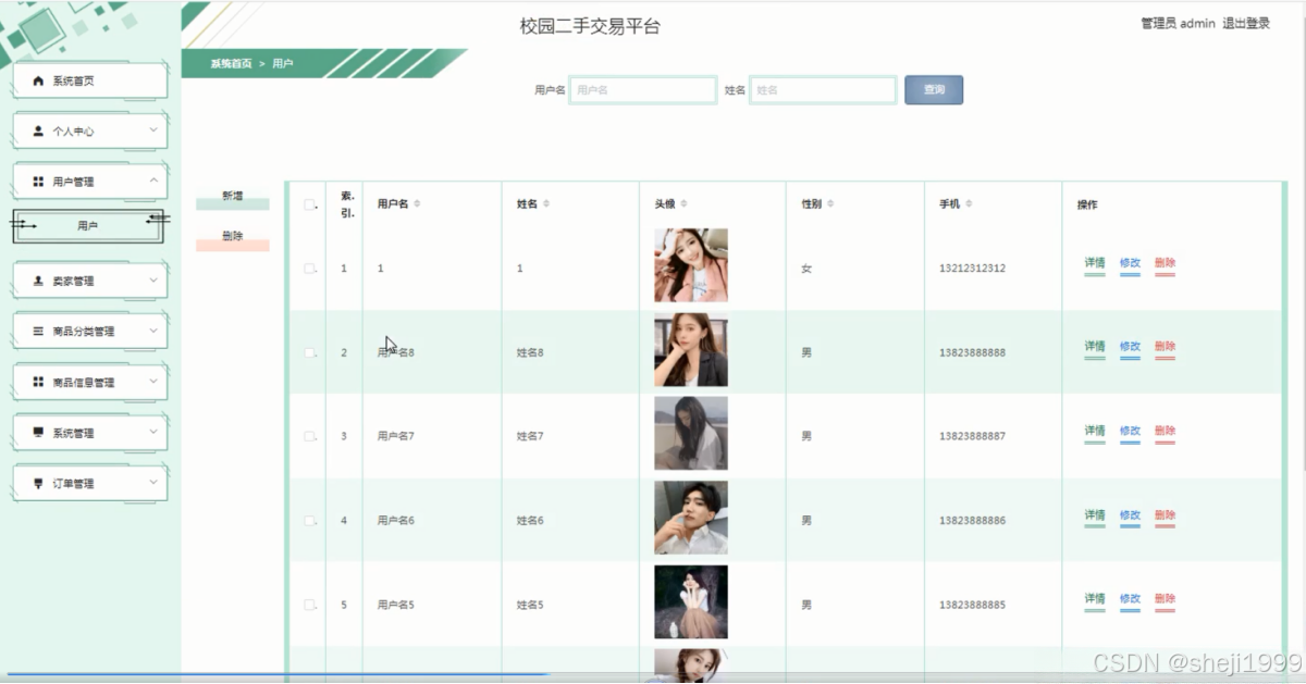 管理员点击用户管理。进入用户管理页面输入用户名、姓名进行查询、新增和删除用户详细信息,并进行详情,修改和删除操作;如图5-8所示: