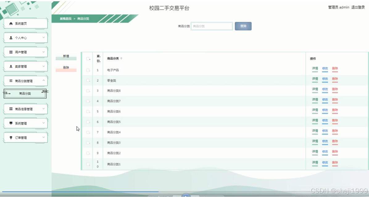 管理员点击商品分类管理。进入商品分类页面输入商品分类可以查询、新增或删除商品分类详细信息,并进行查看详情,修改和删除等操作。如图5-10所示: