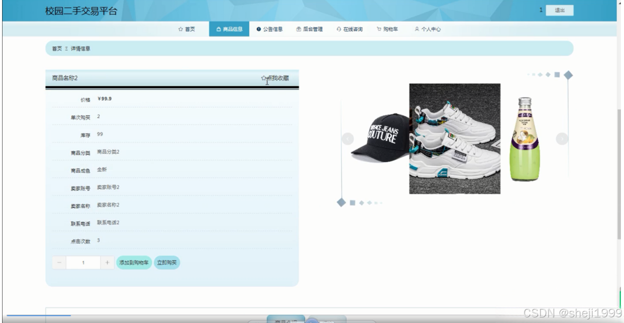 在商品信息页面的输入商品名称、选择商品成色、卖家账号和价格进行查询商品详细信息;并进行收藏、添加到购物车、立即购买或评论等操作;商品详细信息页面如图5-3所示:
