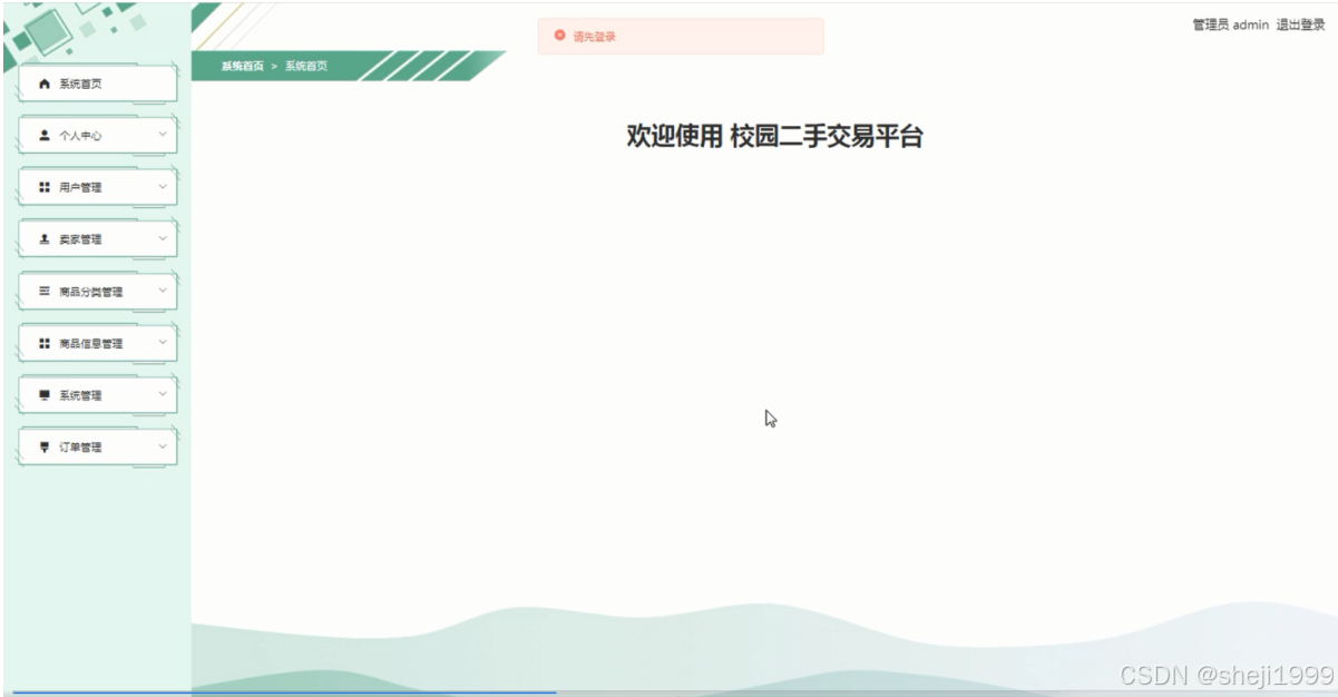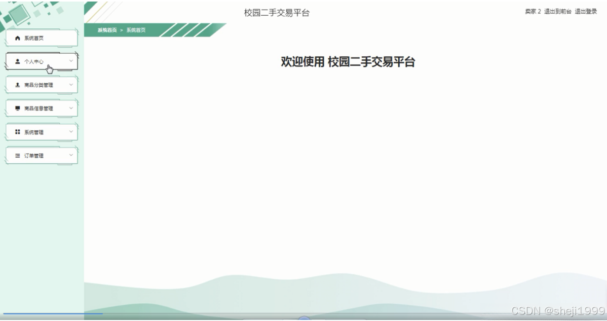 管理员进入主页面,主要功能包括对个人中心、用户管理、卖家管理、商品分类管理、商品信息管理、系统管理、订单管理等进行操作。管理员主页面如图5-7所示: