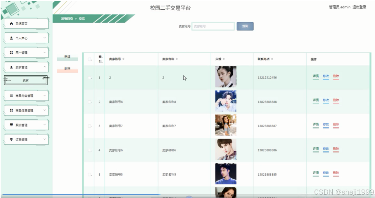 管理员点击卖家管理。进入卖家页面输入卖家账号可以查询、新增或删除卖家详细信息,并进行查看详情,修改和删除等操作。如图5-9所示: