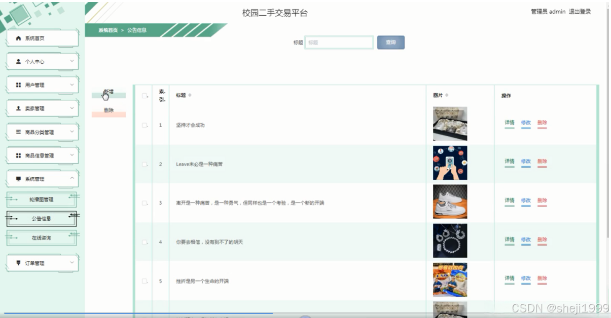 管理员点击系统管理可以对轮播图管理、公告信息和在线咨询进行详细操作,比如在公告信息页面输入标题进行查询,新增或删除公告详细信息,并进行详情,修改和删除操作;如图5-12所示:
