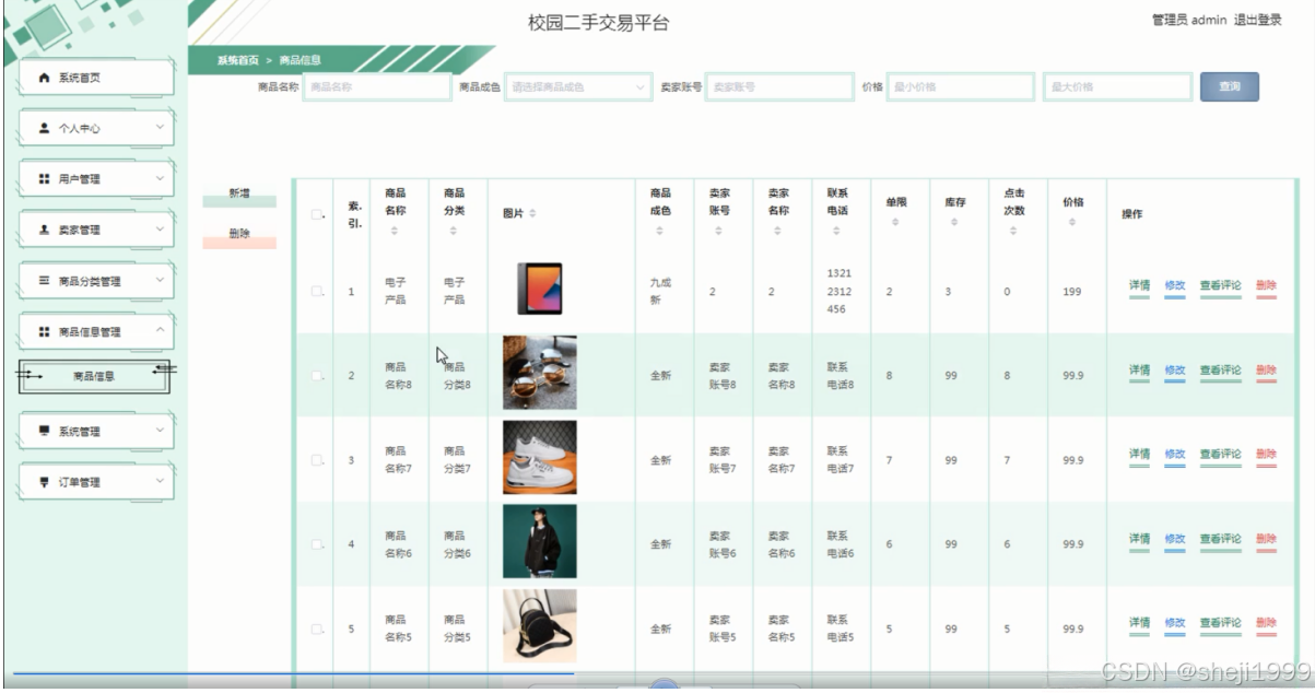 管理员点击商品信息管理。进入商品信息页面输入商品名称、选择商品成色、卖家账号和价格可以查询、新增或删除商品详细信息,并进行查看详情,修改、查看评论和删除操作。如图5-11所示:
