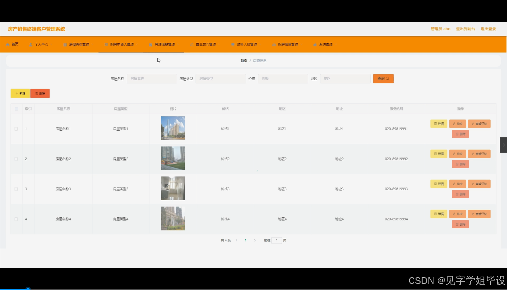 - 房源信息展示功能:构建房源信息数据库,存储各类房源的详细信息,包括房屋地址、面积、户型、价格、房屋状态(在售、已售等)等。通过直观的界面展示房源信息,支持按照不同的条件(如价格区间、房屋类型、地理位置等)进行筛选和排序,以便购房申请人能够快速找到符合自己需求的房源。例如,客户可以根据自己的喜好,通过系统筛选出某一区域内特定面积和价格的房源。