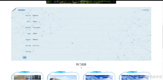 学校学院:在学校学院页面的输入栏中输入学院名称、学院专业、负责人、联系电话、分数线、学院地址、成立日期、点击次数进行查询,可以查看到学校学院详细信息,并根据需要进行填报或收藏操作;学校学院页面如图5-3所示: