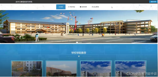 当人们打开系统的网址后,首先看到的就是首页界面。在这里,人们能够看到高考志愿填报指导系统的导航条,通过导航条导航进入各功能展示页面进行操作。系统首页界面如图5-1所示: