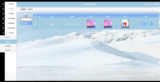 管理员点击系统管理。在系统简介页面输入标题进行查询系统简介列表,并根据需要对系统简介详情信息进行详情或修改操作;还可以对关于我们、轮播图管理、指导信息进行相应操作;如图5-11所示: