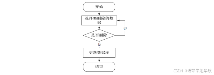 删除操作在系统中并非是必须的,可根据用户及系统的需要来决定是否添加删除功能,删除操作就是使用delete语句将数据库中的某一匹配数据删除,因为此操作会导致用户数据丢失,所以为了避免使用者误按删除键,应在用户点击删除按钮时添加一个提示确认弹窗,当用户确定要删除时,再进行数据库的操作,并且在删除操作完成后要对用户进行反馈。删除信息流程图如图3-6所示。