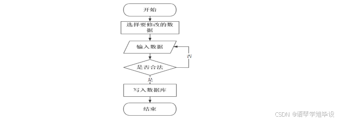 在进行数据更新时,必须要有一个惟一的主关键字,以便数据库能够查询到相应的数据;另外,还必须遵守数据插入过程的操作规范,以确保数据的正确性。修改信息流程图如图3-5所示。