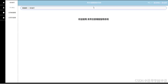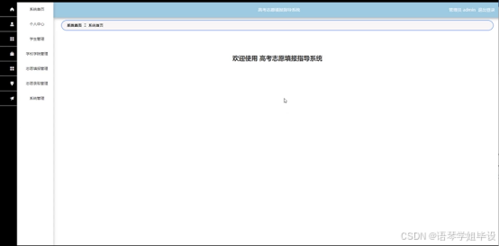 管理员进入主页面,主要功能包括对系统首页、个人中心、学生管理、学校学院管理、志愿填报管理、志愿录取管理、系统管理等进行操作。管理员主页面如图5-6所示: