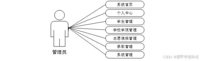 高考志愿填报指导系统的最大权限用户是管理员,通过管理员菜单中的系统首页、个人中心、学生管理、学校学院管理、志愿填报管理、志愿录取管理、系统管理等选项来对系统后台信息进行管理。管理员用例如图3-7所示。