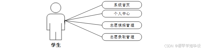 学生进入系统可以对系统首页、个人中心、志愿填报管理、志愿录取管理进行管理。学生用例如图3-8所示。