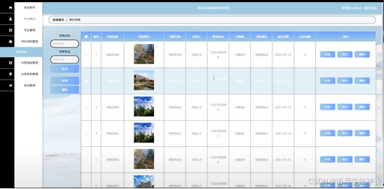 管理员点击学校学院管理。在学校学院页面输入学院名称和学院专业进行查询、新增或删除学校学院列表,并根据需要对学校学院详情信息进行详情、修改或删除操作;如图5-8所示: