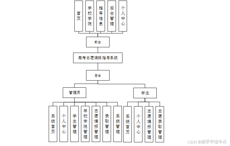 高考志愿填报指导系统的整体结构设计主要分为两大部分:管理员和学生。管理员的职责是管理学生信息及设置学生权限,发布公告等其他基础功能的管理;学生进入系统可以实现首页、个人中心、志愿填报管理、志愿录取管理;管理员主要负责对系统首页、个人中心、学生管理、学校学院管理、志愿填报管理、志愿录取管理、系统管理进行管理。整体结构设计如图4-2所示。