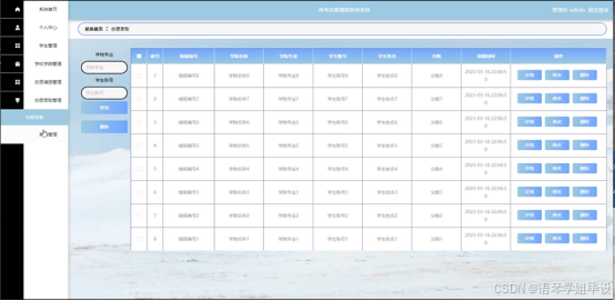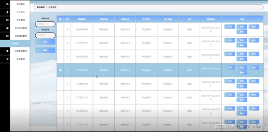 管理员点击学生管理。在学生页面输入学生账号和性别进行查询、新增或删除学生列表,并根据需要对学生详情信息进行详情、修改或删除操作;如图5-7所示: