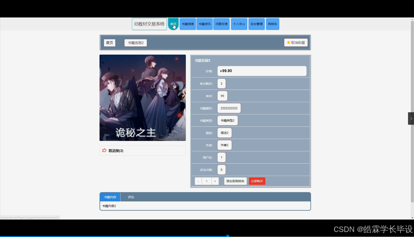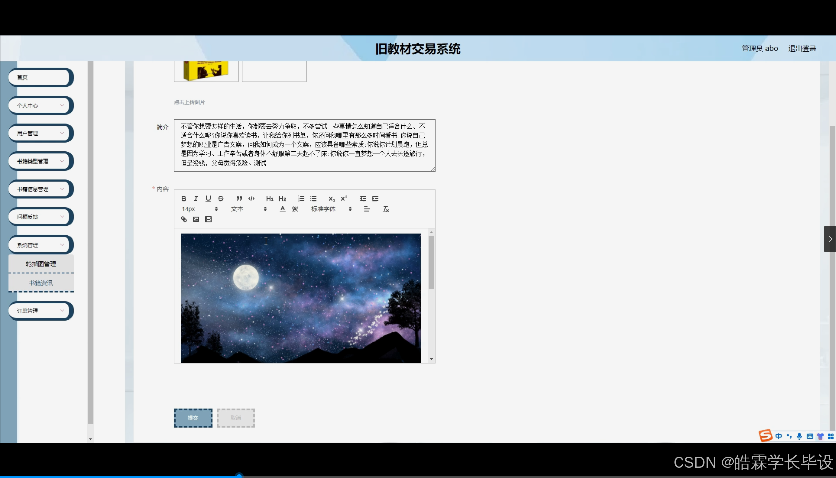 - 基本信息录入:包括教材的书名、作者、出版社、出版年份、新旧程度等基本信息的录入。这些信息将为用户提供对教材的初步了解,帮助用户判断是否符合自己的需求。