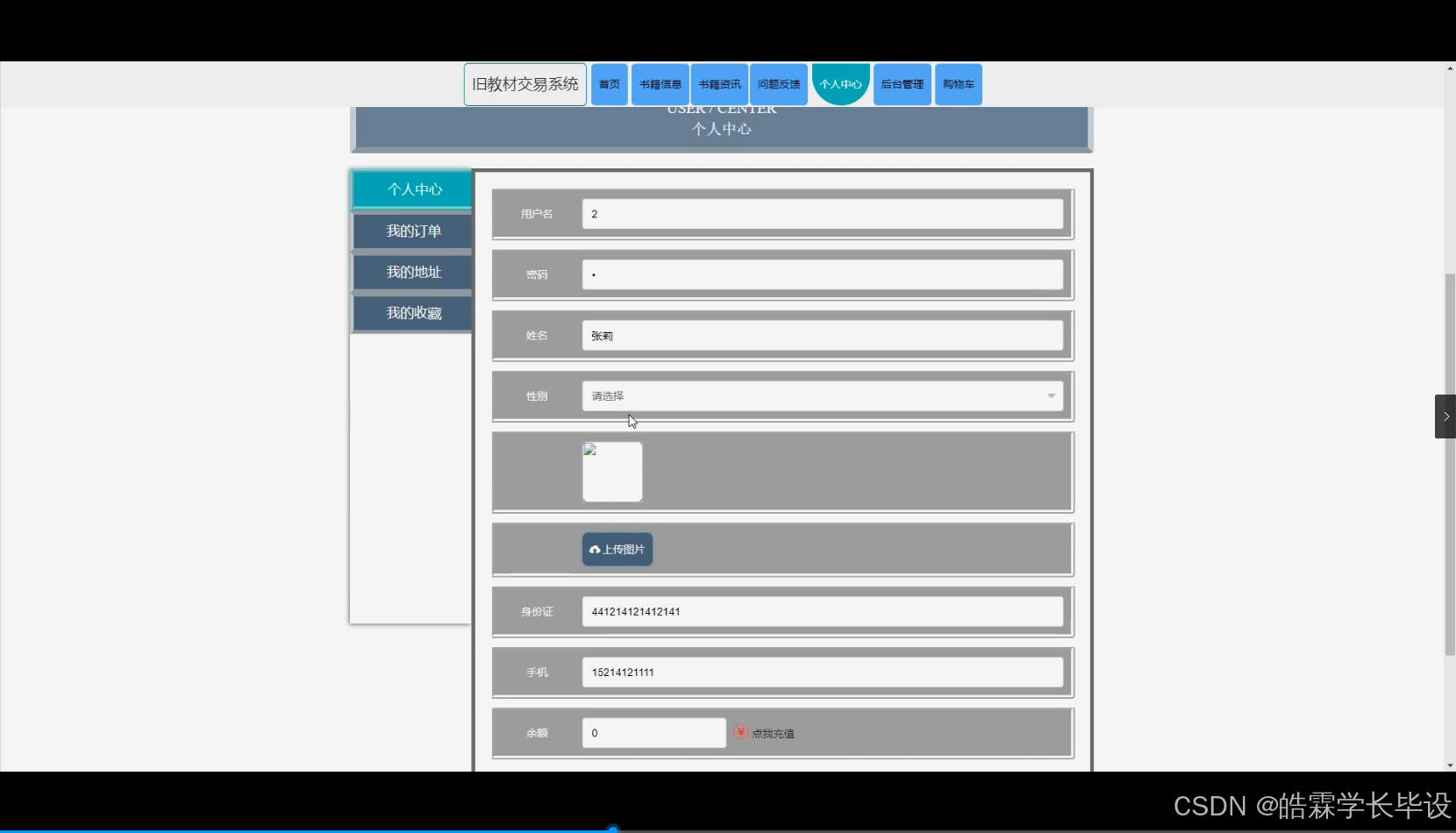 - 用户信息管理:包括用户的基本信息(如姓名、联系方式等)、交易历史记录、信用评价等信息的管理。通过用户信息管理,可以为用户提供个性化的服务,如根据用户的交易历史推荐相关教材。