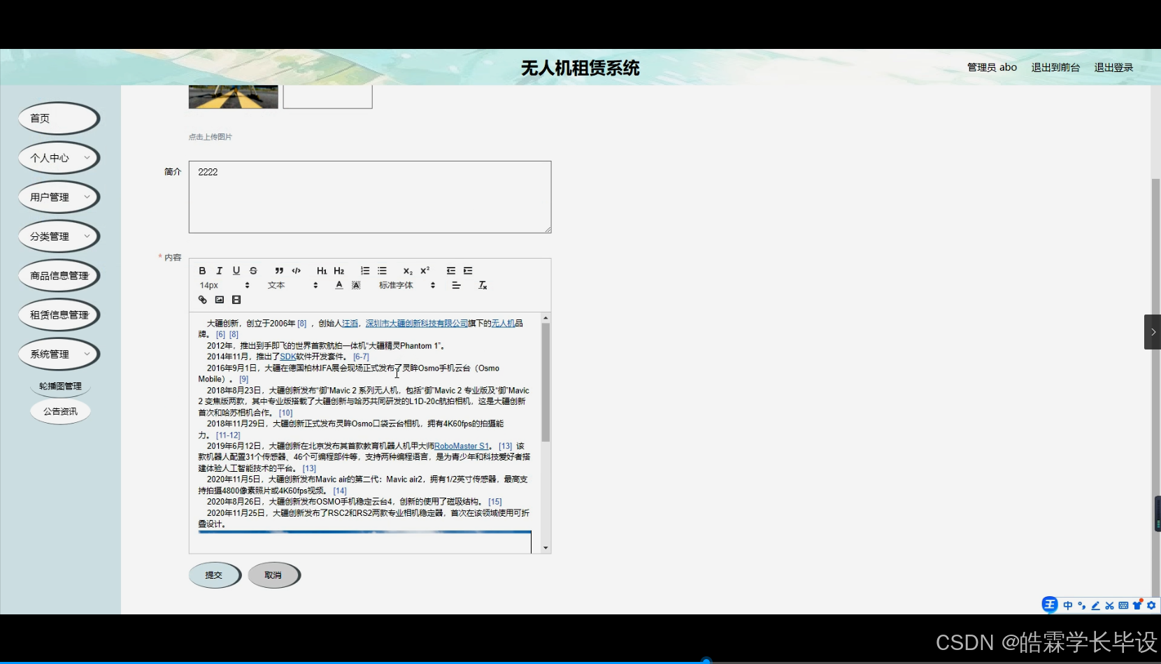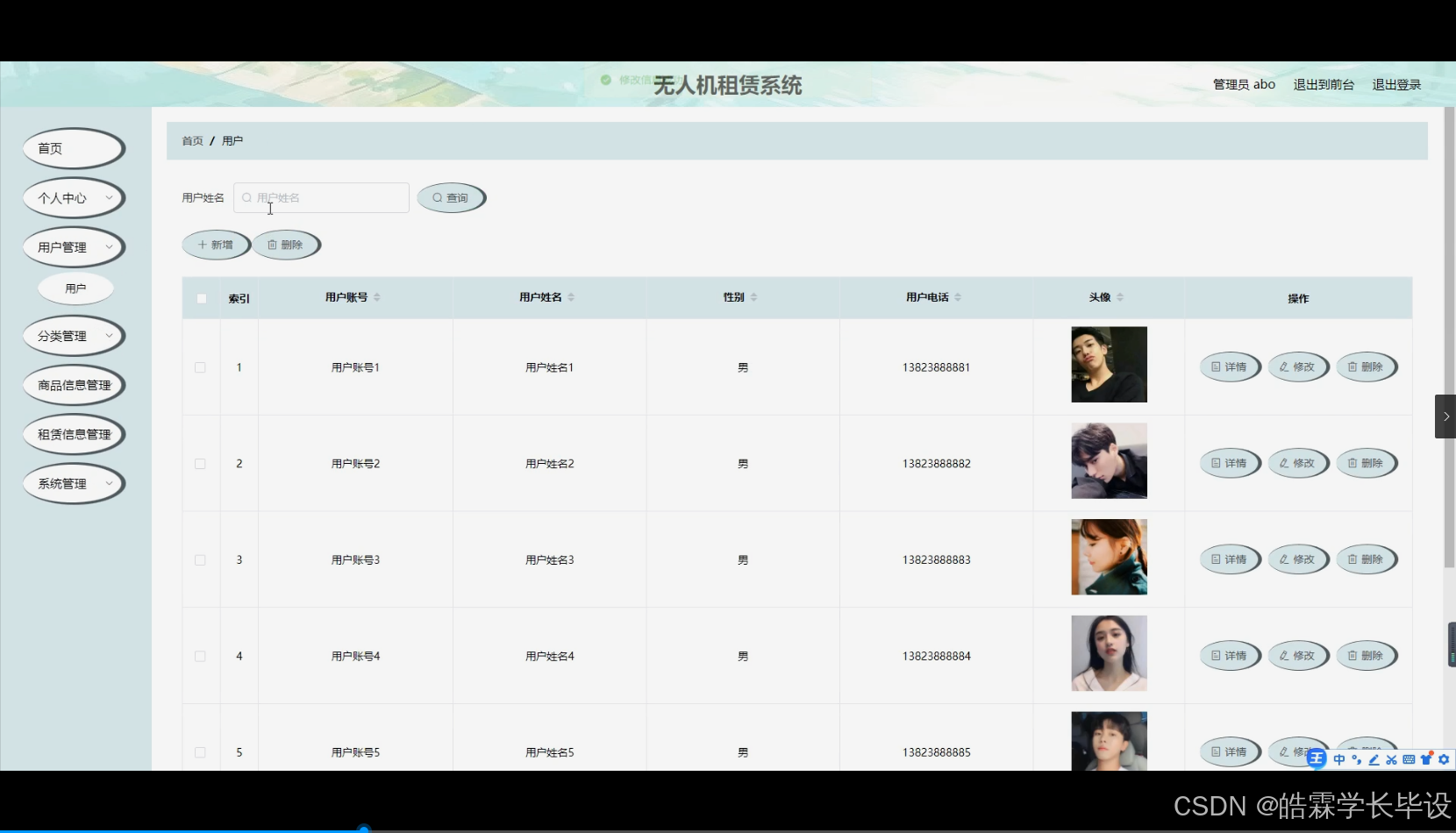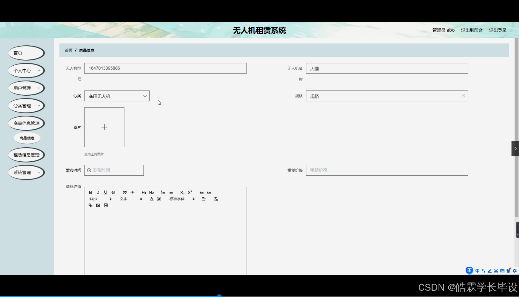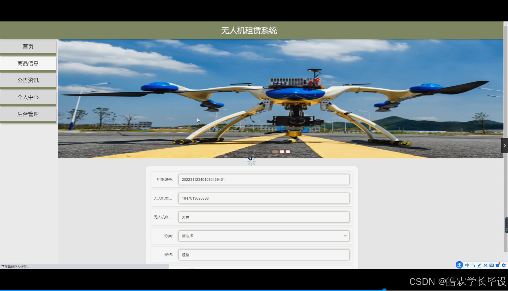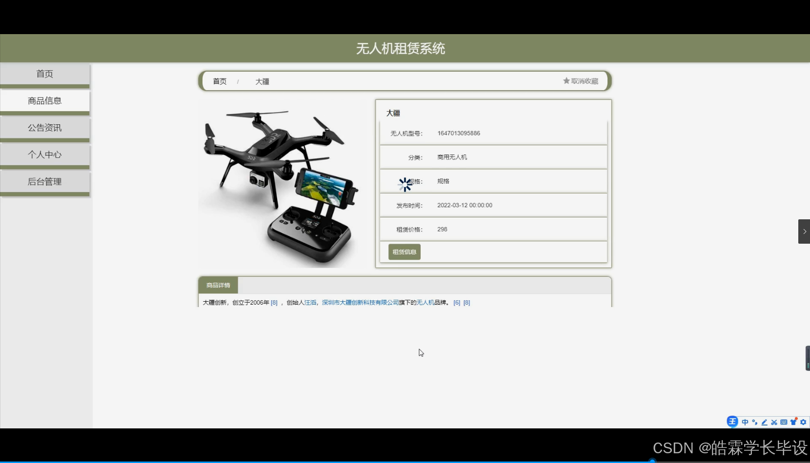 - 商品信息管理功能:详细管理无人机的各种信息,如性能参数、价格、租赁时长、配套设备等。准确的商品信息展示能够帮助用户做出明智的租赁决策,同时也为租赁公司的运营管理提供基础数据支持。