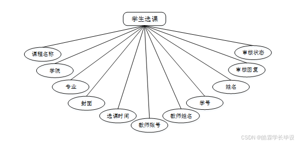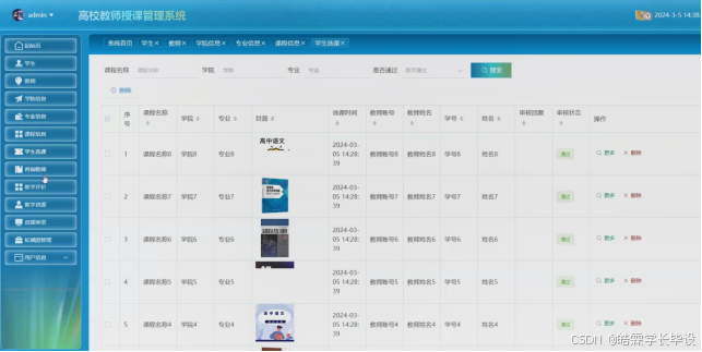 学生选课管理:管理员可以查看和管理学生的选课信息,包括课程名称、学院、专业、封面、选课时间、教师账号、教师姓名、学号、姓名、审核回复、审核状态等。