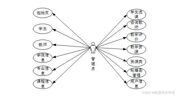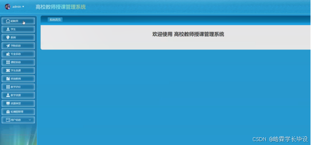管理员进入系统主页面,主要功能包括对起始页、学生、教师、学院信息、专业信息、课程信息、学生选课、咨询教师、教学评价、教学资源、资源类型、轮播图管理、用户信息等进行操作。管理员主页面如图5-8所示: