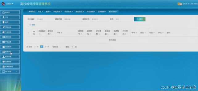 教学评价管理:管理员可以查看和管理教学评价信息,包括评价编号、课程名称、封面、教师账号、教师姓名、评价课程、教学质量、满意程度、评价时间、学号、姓名、专业、学院等。