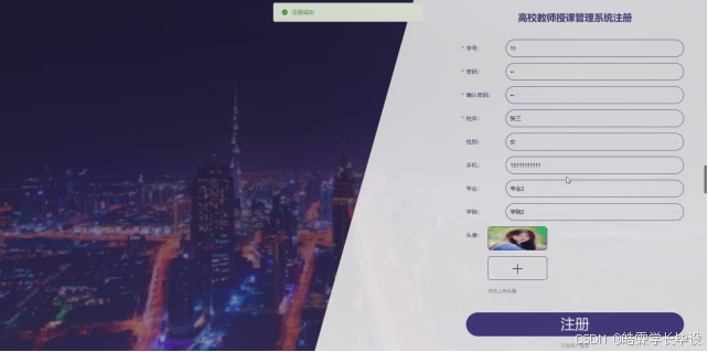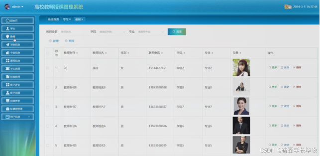 教师管理:管理员可以添加、修改、删除和查询教师的信息,包括教师账号、姓名、性别、学院、专业、联系电话等。