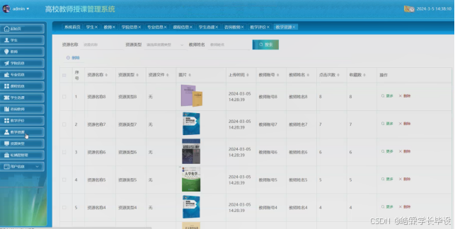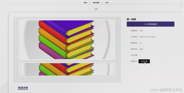 教学资源管理:管理员可以添加、修改、删除和查询教学资源信息,包括资源名称、资源类型、资源文件、图片、上传时间、教师账号、点击次数、收藏数等。