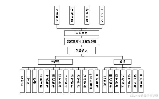 本系统采用B/S架构,以Java语言作为主要开发语言,结合SSM(Spring、SpringMVC、MyBatis)框架,使用MySQL数据库进行数据管理。前端则采用HTML、CSS、JavaScript和Vue.js进行构建,这些技术使得用户界面的交互性和友好性得到了大大提升。系统分为前台用户界面和后台管理界面。前台用户界面主要提供课程信息查询、教学资源浏览、个人中心管理等功能,使用户能够方便地获取相关信息。后台管理界面则为管理员提供了强大的管理工具,包括教师管理、学生管理、课程信息管理、学生选课管理、咨询教师管理、教学评价管理、教学资源管理等,帮助管理员高效地管理高校教师授课工作。