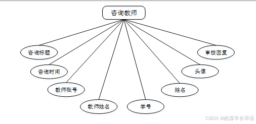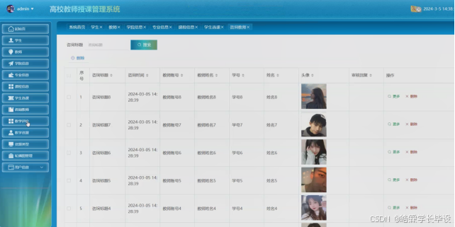 咨询教师管理:管理员可以查看和管理学生的咨询信息,包括咨询标题、咨询时间、教师账号、教师姓名、学号、姓名、头像、回复内容等。
