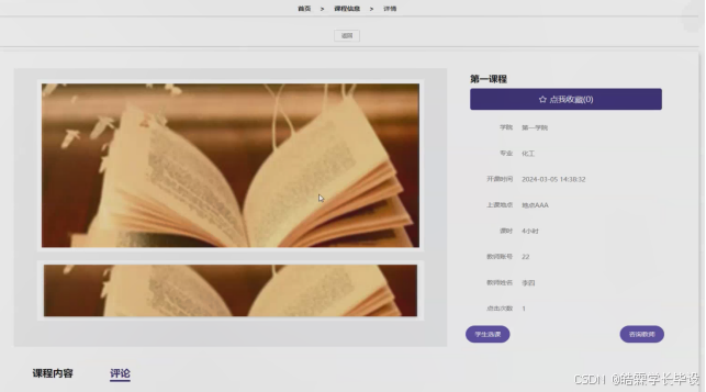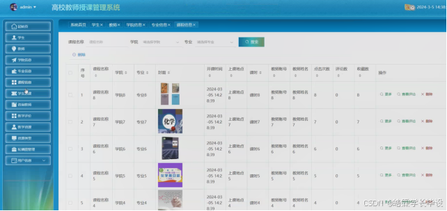 课程信息管理:管理员可以添加、修改、删除和查询课程信息,包括课程名称、学院、专业、封面、开课时间、上课地点、课时、教师账号、教师姓名、点击次数、评论数、收藏数等。