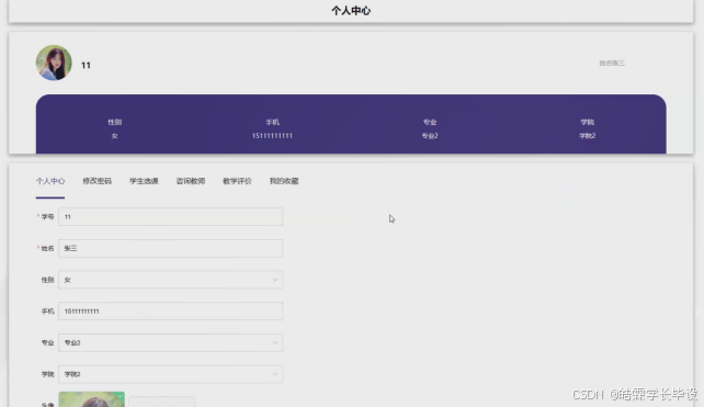 个人中心:用户可以查看和修改自己的个人信息,包括修改密码、查看选课信息、咨询教师、教学评价、我的收藏等。