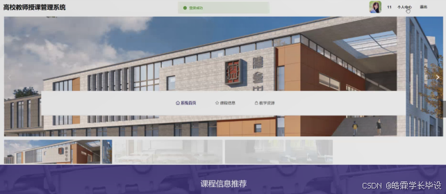 当学生打开系统的网址后,首先看到的就是首页界面。在这里,学生能够看到高校教师授课管理系统的导航条显示系统首页、课程信息、教学资源、个人中心 。系统首页界面如图5-1所示: