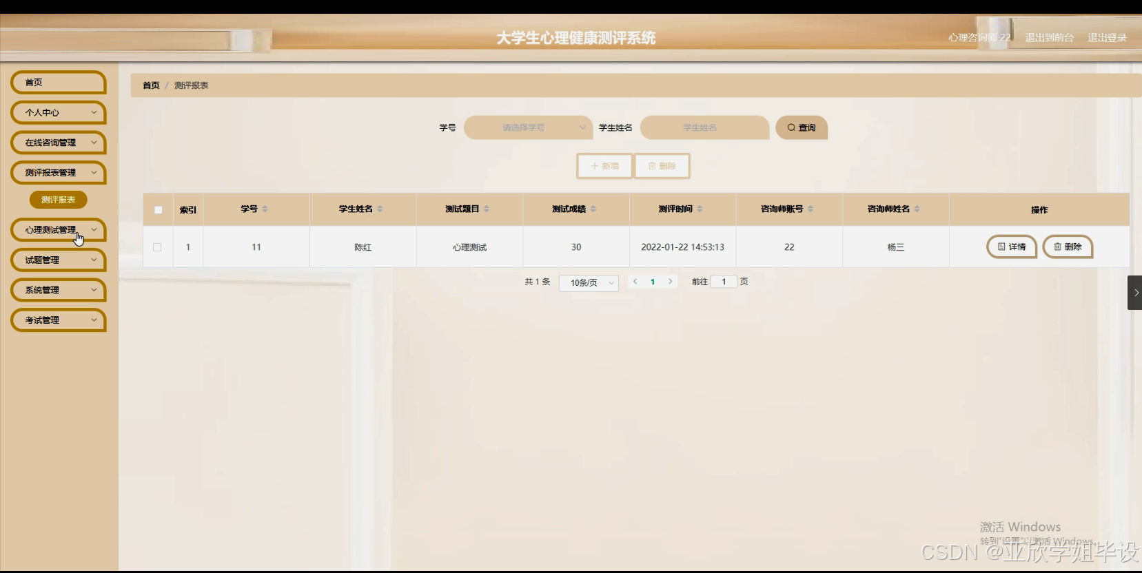 本选题针对大学生心理健康等问题的研究具有重要的现实意义。随着大学生心理健康问题的日益凸显,如学业压力、社交困扰、就业焦虑等带来的心理压力,一个有效的心理健康测评系统能够及时发现大学生的心理问题,为心理咨询师提供准确的参考依据,以便对有需要的学生进行精准的干预和辅导。同时,在线咨询功能可以方便学生随时获取心理支持,测评报表功能有助于学校和教师全面了解学生的心理健康状况,进而采取针对性的教育措施。