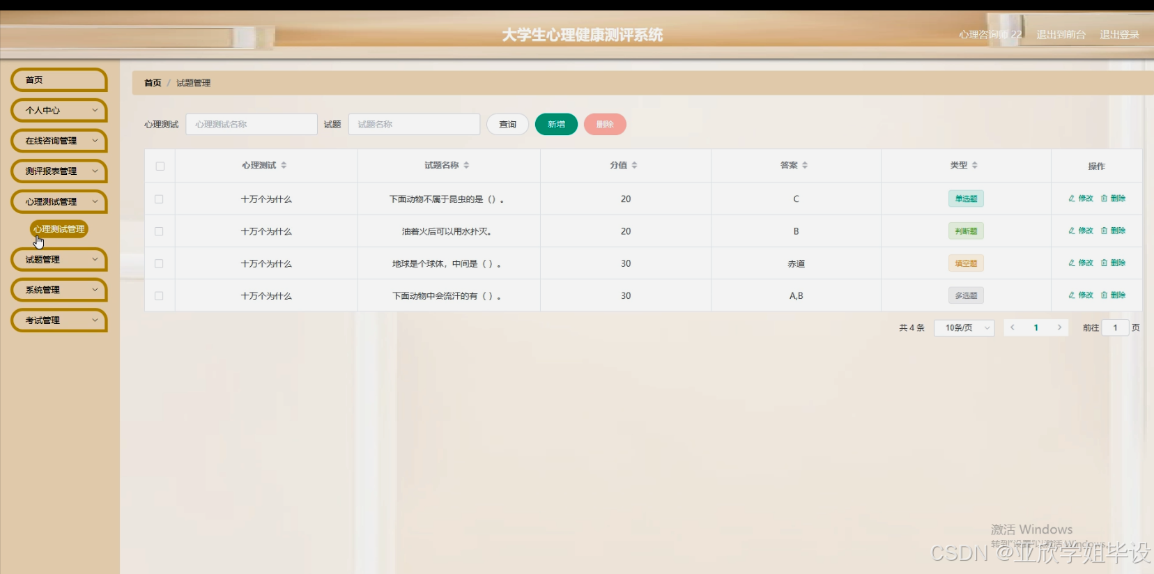 - 构建一套完整的大学生心理健康测评系统:包括系统的需求分析报告、功能设计文档、详细的测评指标体系以及系统的原型或实际运行系统。