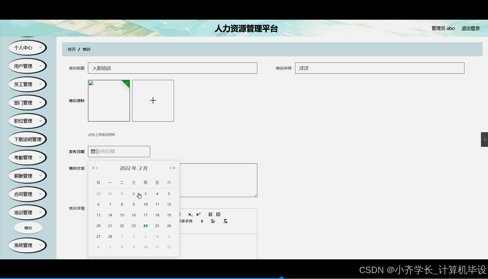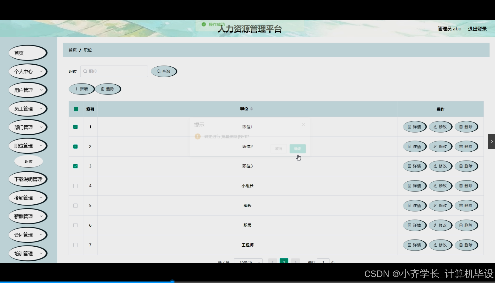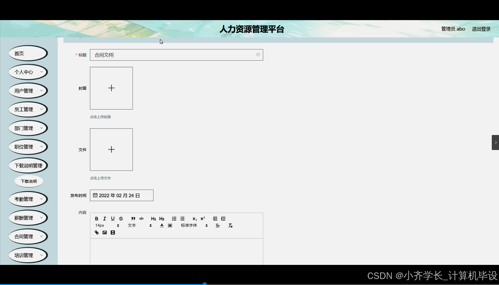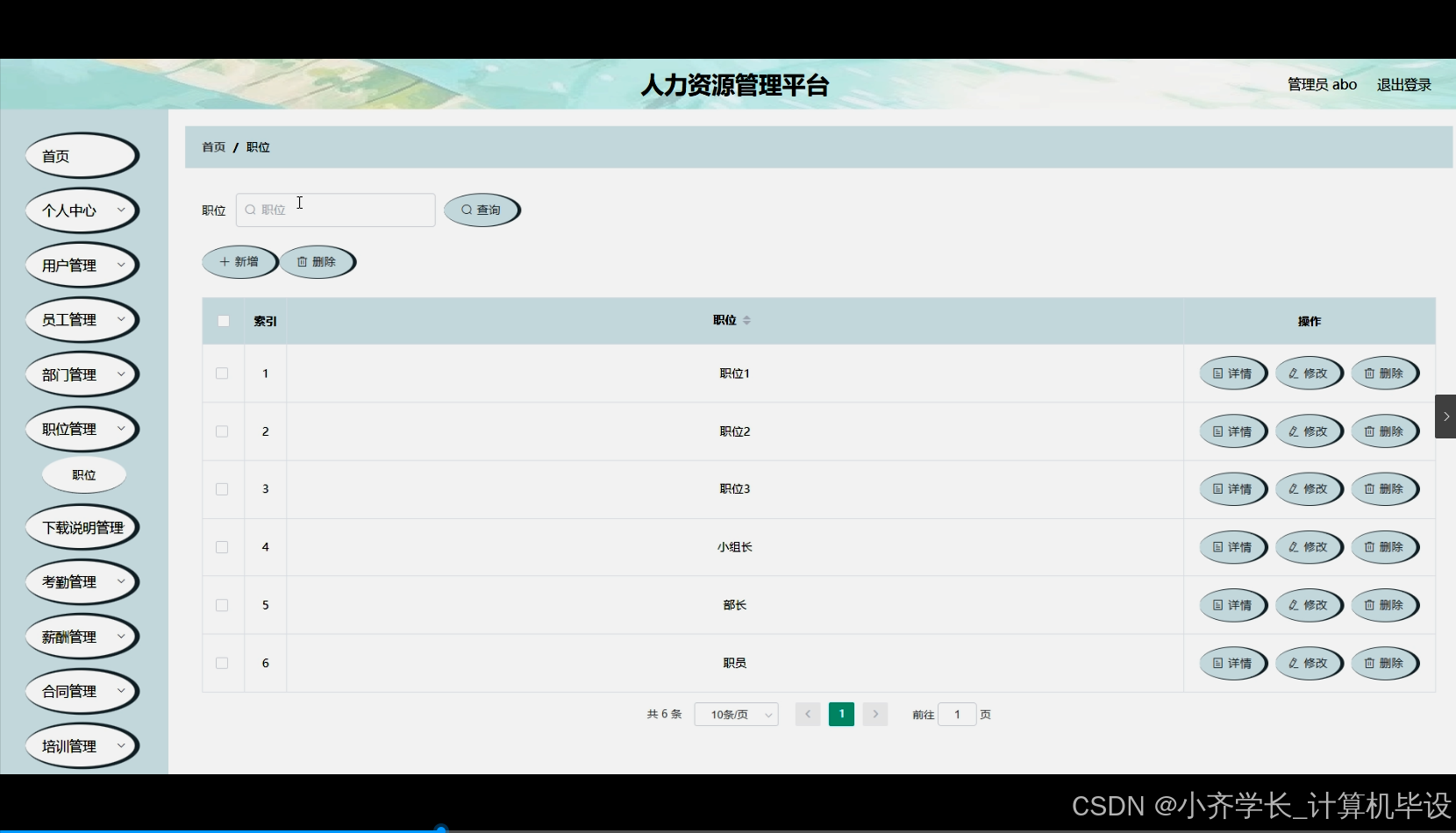 - 完成人力资源管理平台的设计与开发:构建一个具备用户、员工、部门、职位、考勤、薪酬、合同、培训等功能的人力资源管理平台原型,能够满足中小企业的基本人力资源管理需求。