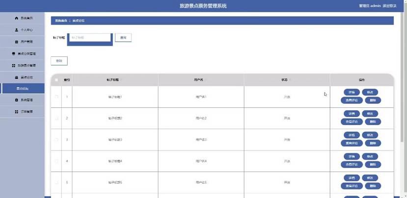 管理员点击景点论坛。进入景点论坛页面输入贴子标题可以查询或删除景点论坛列表,并对景点论坛详细信息进行查看详情,修改,查看评论或删除操作。如图5-10所示: