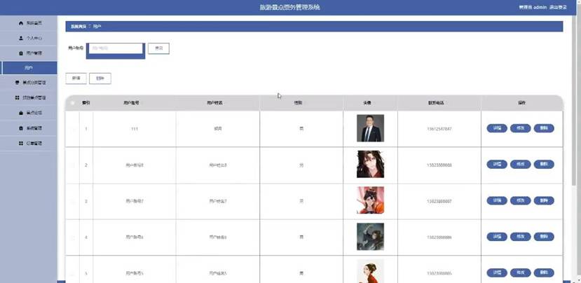 管理员点击用户管理。进入用户页面输入用户账号可以查询,新增或删除用户列表,并对用户详细信息进行查看详情,修改或删除操作。如图5-8所示: