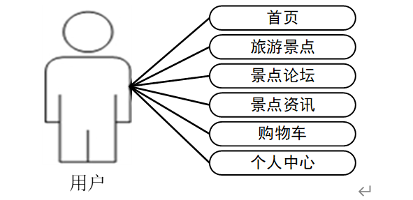 用户用例图根据用户的需求进行分析,包括用户登录注册,旅游景点,景点论坛,景点资讯,购物车,个人中心等。用户用例图如下所示:
