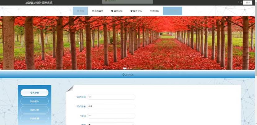 - 个人中心:两类角色均可维护个人信息(修改密码、更新头像);用户可查看订单记录、收藏景点;管理员可配置系统参数;