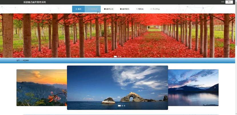 当人们打开系统的网址后,首先看到的就是首页界面。在这里,人们能够看到旅游景点票务管理系统的导航条=。系统首页界面如图5-1所示:
