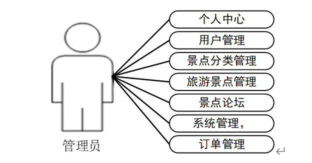 管理员用例图依据管理员的权限需求以及对系统的管理需求进行分析,主要包括了登录,个人信息修改,用户管理,景点分类管理,旅游景点管理,景点论坛,系统管理,订单管理等,管理员用例图如下所示: