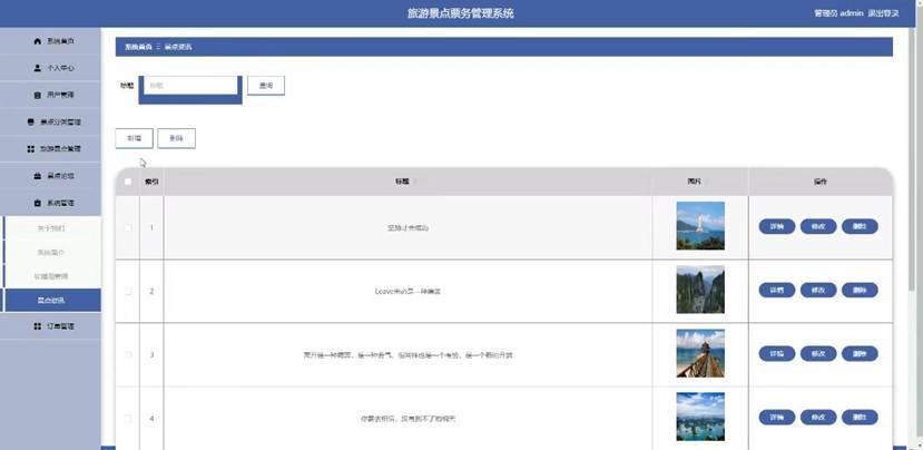 管理员点击系统管理。进入景点资讯页面输入标题可以查询,新增或删除景点资讯列表,并对景点资讯详细信息进行查看详情,修改或删除操作。如图5-11所示: