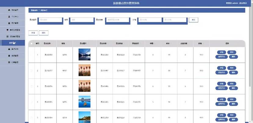 管理员点击旅游景点管理。进入旅游景点页面输入景点名称,城市,景点分类和价格可以查询,新增或删除旅游景点列表,并对旅游景点详细信息进行查看评论,详情,修改或删除操作。如图5-9所示: