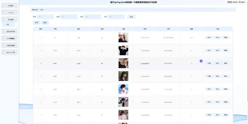 管理员点击学生管理。进入学生页面输入学号、姓名、手机和卡号可以查询,新增或删除学生信息列表,并根据需要对学生详细信息进行查看详情,修改和删除等操作。如图5-3所示: