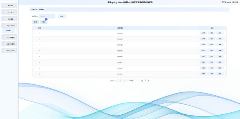 管理员点击消费类型管理。进入消费类型页面输入消费类型可以查询,新增或删除消费类型列表,并根据需要对消费类型详细信息进行查看详情,修改和删除等操作。如图5-4所示: