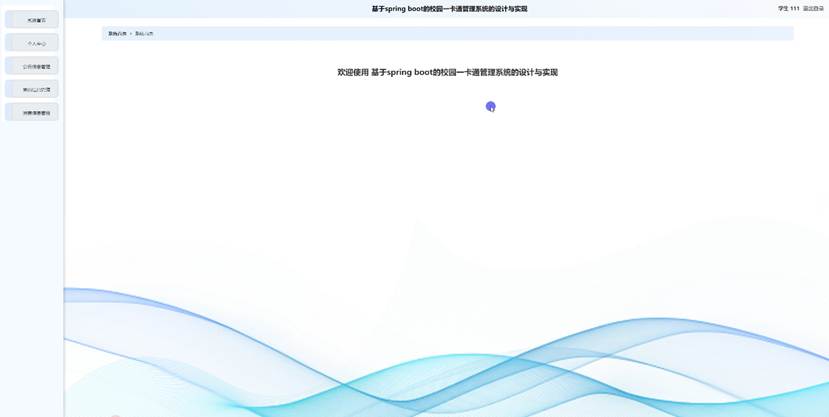 学生进入系统后台可以对系统首页、个人中心、公告信息管理、充值信息管理、消费信息管理等功能进行操作。学生主界面如图5-8所示:
