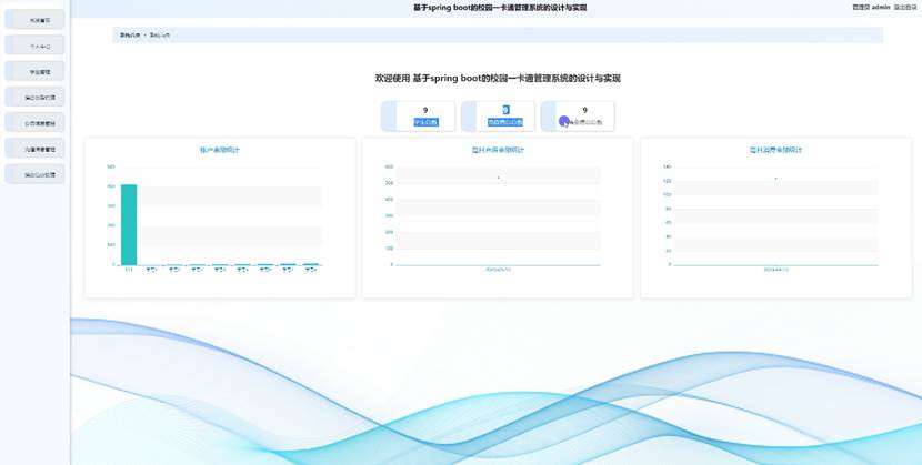管理员进入主界面,主要功能包括对系统首页、个人中心、学生管理、消费类型管理、公告信息管理、充值信息管理、消费信息管理等进行操作。管理员主界面如图5-2所示:
