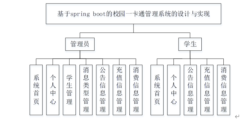 对本系统进行全面的系统功能的分析,可以得出基于spring boot的校园一卡通管理系统的设计与实现的功能模块图,如图4-1所示。