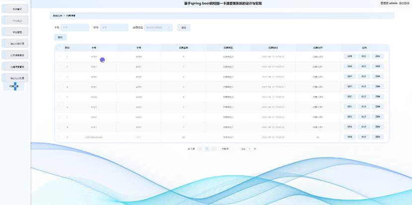 管理员点击消费信息管理,进入消费信息页面输入卡号、学号和消费类型可以查询或删除消费信息列表,并根据需要对消费详细信息进行详情,修改或删除操作。如图5-7所示: