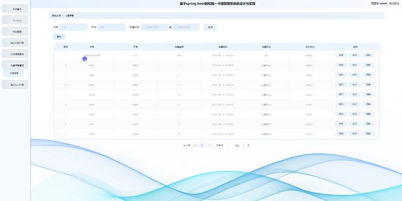 管理员点击充值信息管理。进入充值信息页面输入卡号、学号和充值时间可以查询或删除充值信息列表,并根据需要对充值详细信息进行详情,修改或删除操作。如图5-6所示: